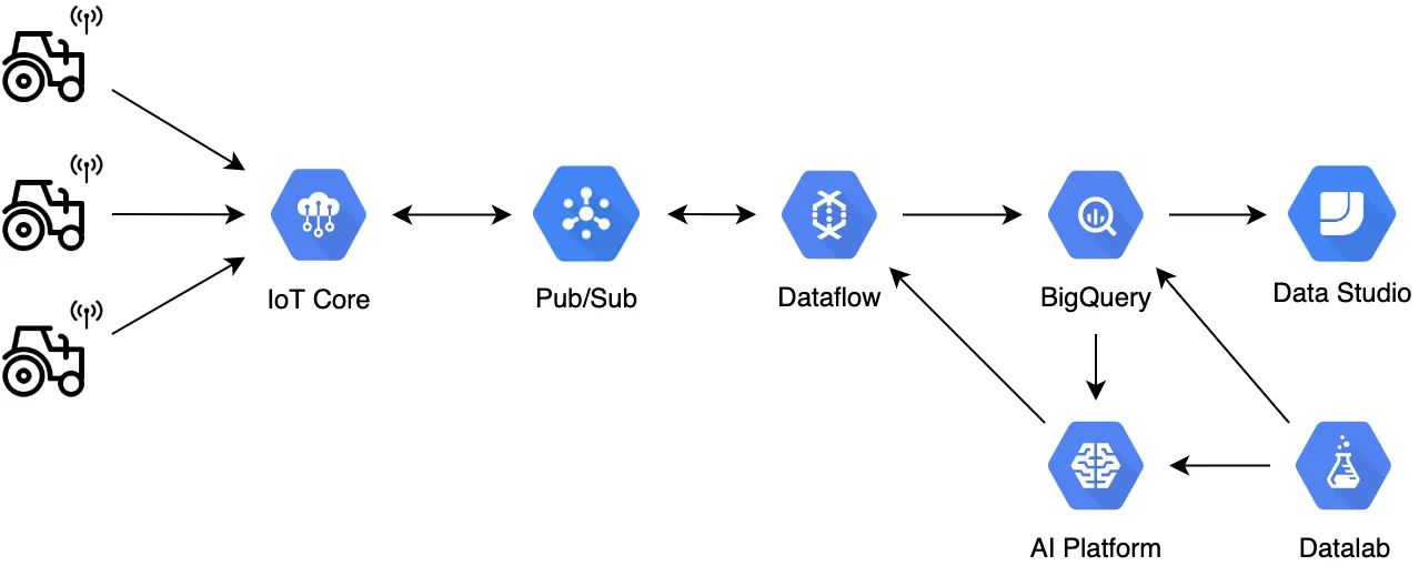 | Predictive Analytics. | Vertex AI (formerly Cloud ML Engine) utilizes data from BigQuery to predict customer needs and breakdowns, optimizing parameters for deployment back to devices. |