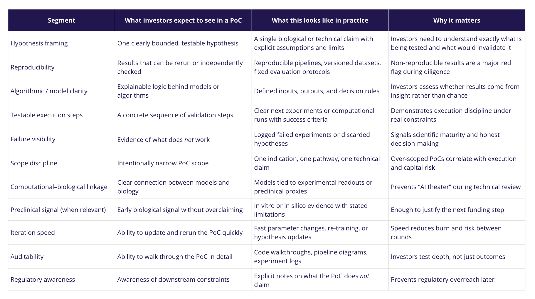 An investor-ready PoC in biotech demonstrates a reproducible, stepwise path from hypothesis to evidence that can be evaluated under real scientific, technical, and regulatory constraints. By making execution logic and commercial direction inspectable-often through a working prototype-it enables investors to assess risk, feasibility, and future optionality before committing significant capital.