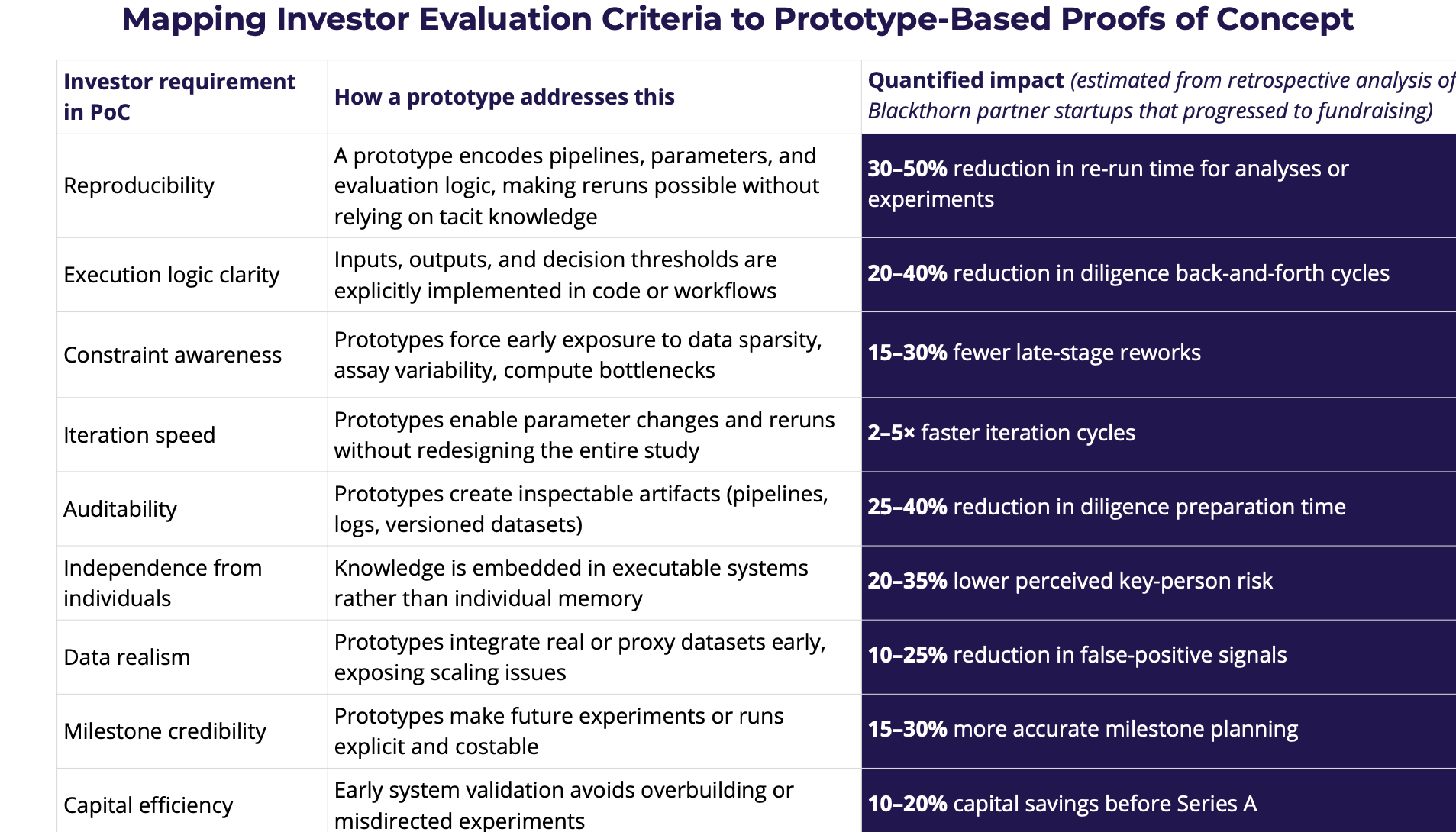 Across multiple investor criteria-reproducibility, auditability, iteration speed, and risk de-risking-executable prototypes consistently emerged as the most reliable form of PoC. By encoding assumptions, constraints, and decision logic into inspectable systems, prototypes convert abstract hypotheses into artifacts that diligence teams can evaluate directly.